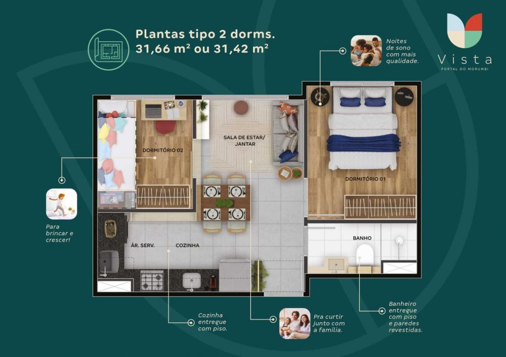 O Vista Portal Morumbi é um condomínio com lazer e Segurança. Possui apartamentos com 2 dormitórios , sala, quarto, cozinha, lavanderia e 1 banheiro. Em uma planta smart muito otimizada, para garantir o conforto da sua família em cada cantinho do seu novo lar.