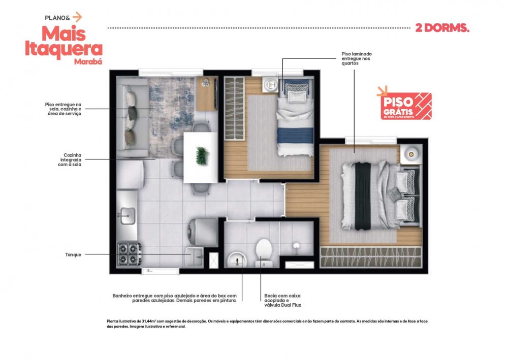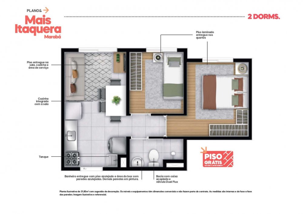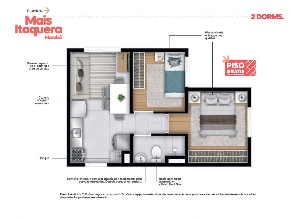 - Aptos. tipo 02 dorms. s/ suíte: 31,15m² a 32,11m²