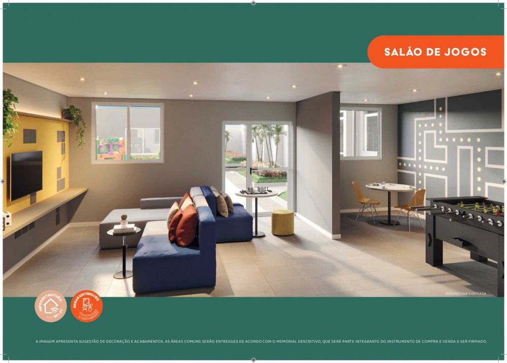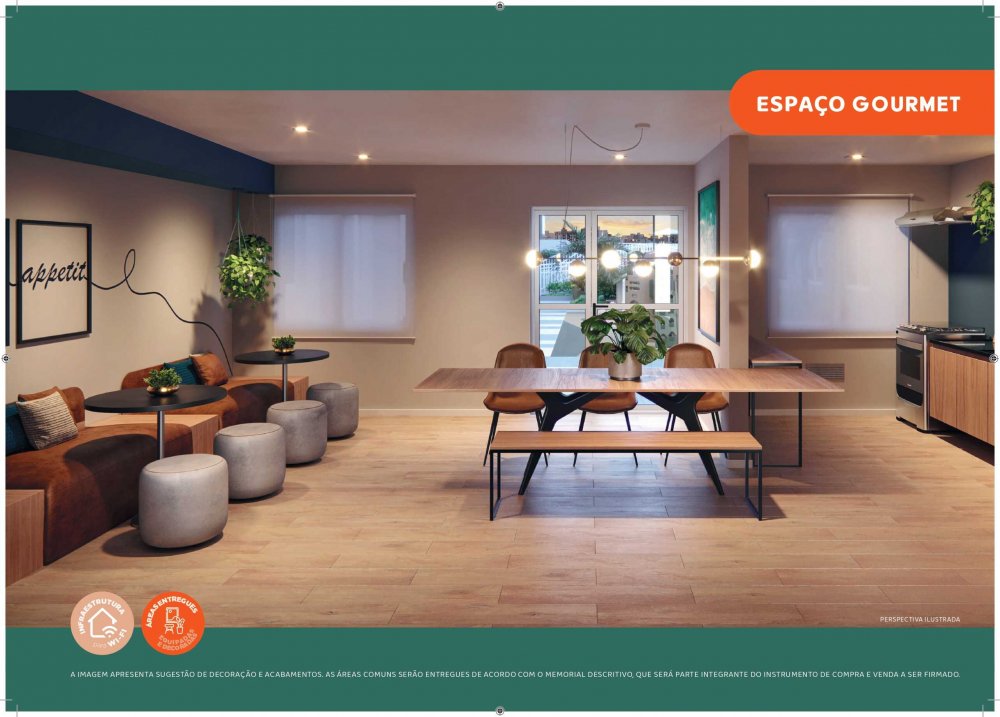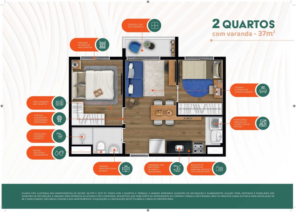 Os apartamentos têm 37 m² ou 40 m² de área privativa, com dois dormitórios, sala de estar e jantar integradas, cozinha americana, banheiro e área de serviço.
