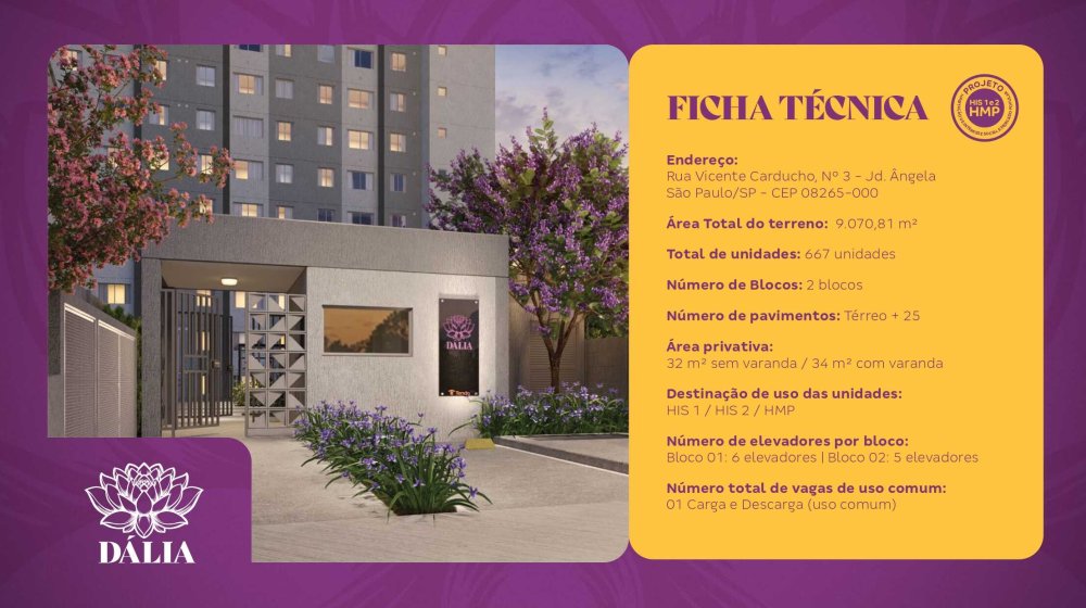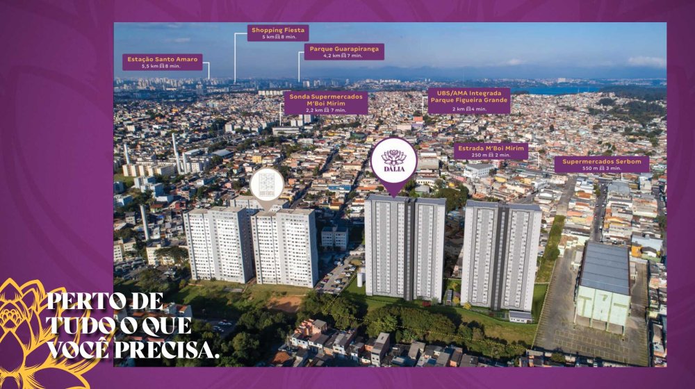 O Dália é o mais novo condomínio de Apartamentos na planta da Tenda no plano casa verde e amarela [ Minha Casa Minha Vida ] . More a 15 minutos da Estação Capão Redondo linha Lilás do Mêtro e do Shopping Campo Limpo em um condomínio com lazer, segurança e acessibilidade, próximo da Estrada do M'Boi Mirim.