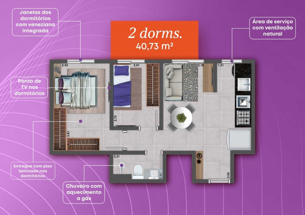 Tipologia: 2 Dormitórios de 36m2, 38m2, 40m2, 41 m2 e Opções de 44 m2 e 47 m2 / com Suíte.