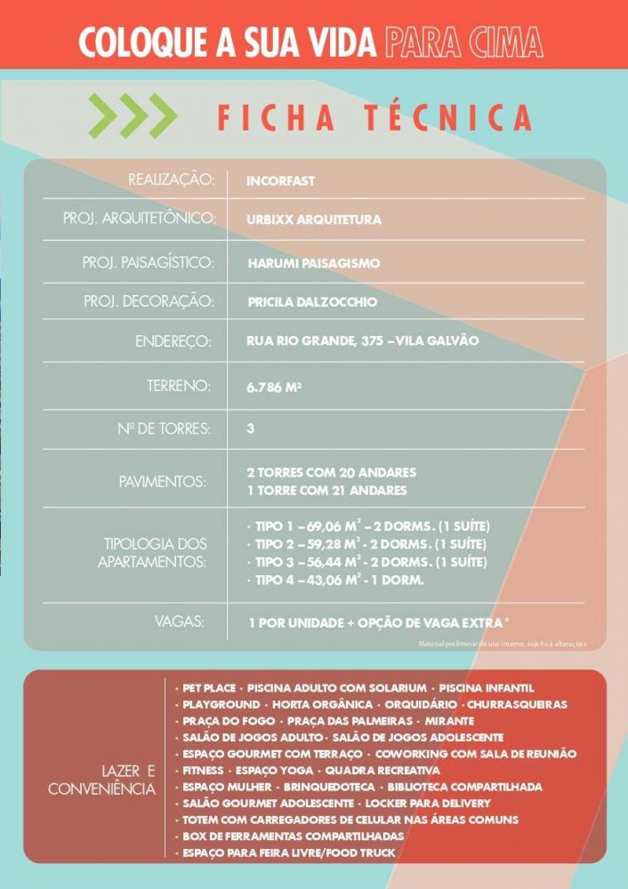 O empreendimento possui todas as praticidades para o seu dia a dia, como espaço fitness, piscinas, espaço gourmet para momentos entre amigos e família, além de um amplo espaço de Coworking.