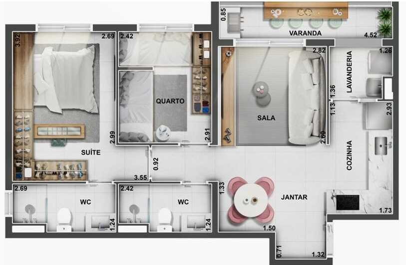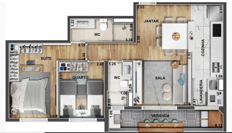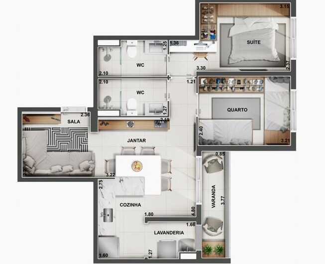 Opções de 43,06m², 55,00m², 59,00m² e 69,06m², 1 ou 2 Dormitorios com Suíte