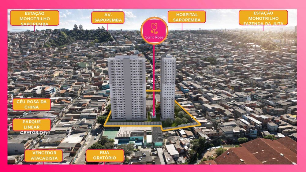 Próximo das Estações Monotrilho da Sapopemba e Fazenda da Juta, ao lado da UBS Fazenda da Juta, do Hospital Estadual de Sapopemba, das escolas SESI Fazenda da Juta e CEU Rosa da China, dos supermercados Relevantes, Vencedor Atacadista, Assaí Atacadista e Comercial Esperança, próximo do Parque Linear Ribeirão Oratório e da Academia Montes Oratório.