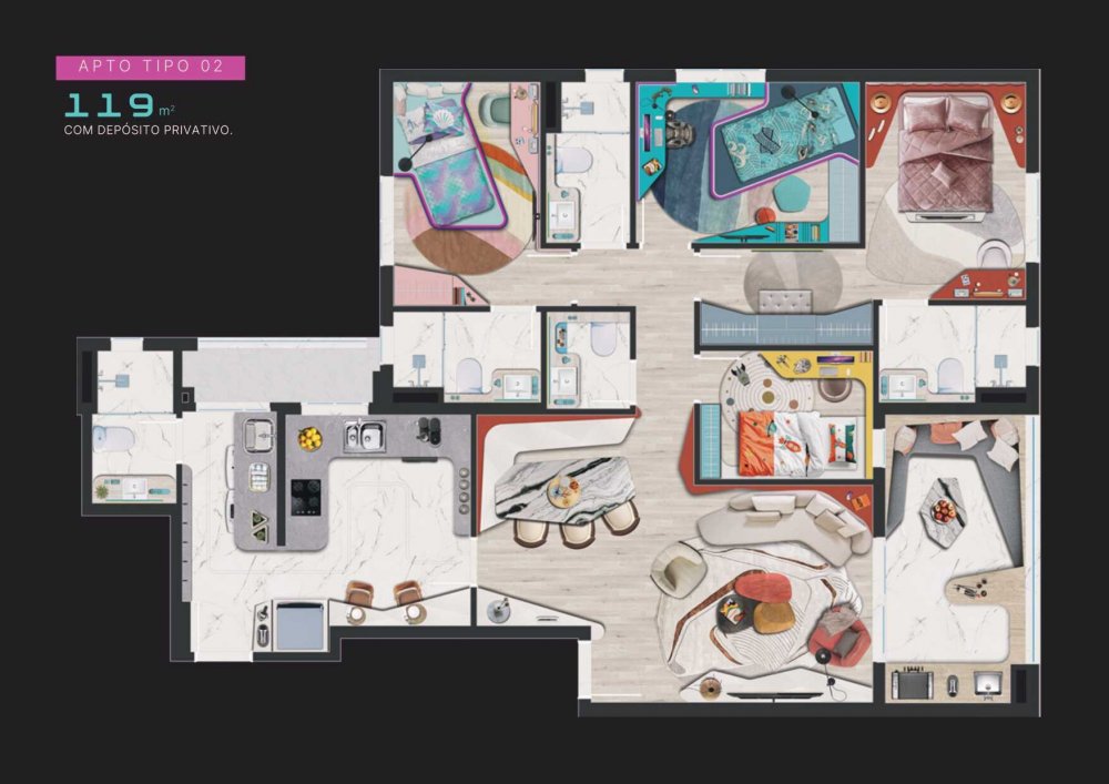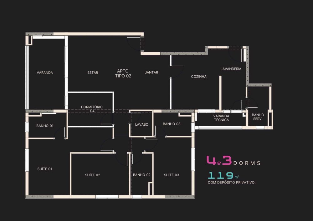 - Planta do Apto. de 119 m² / 4 dormitórios, 2 suítes, terraço com churrasqueira e depósito