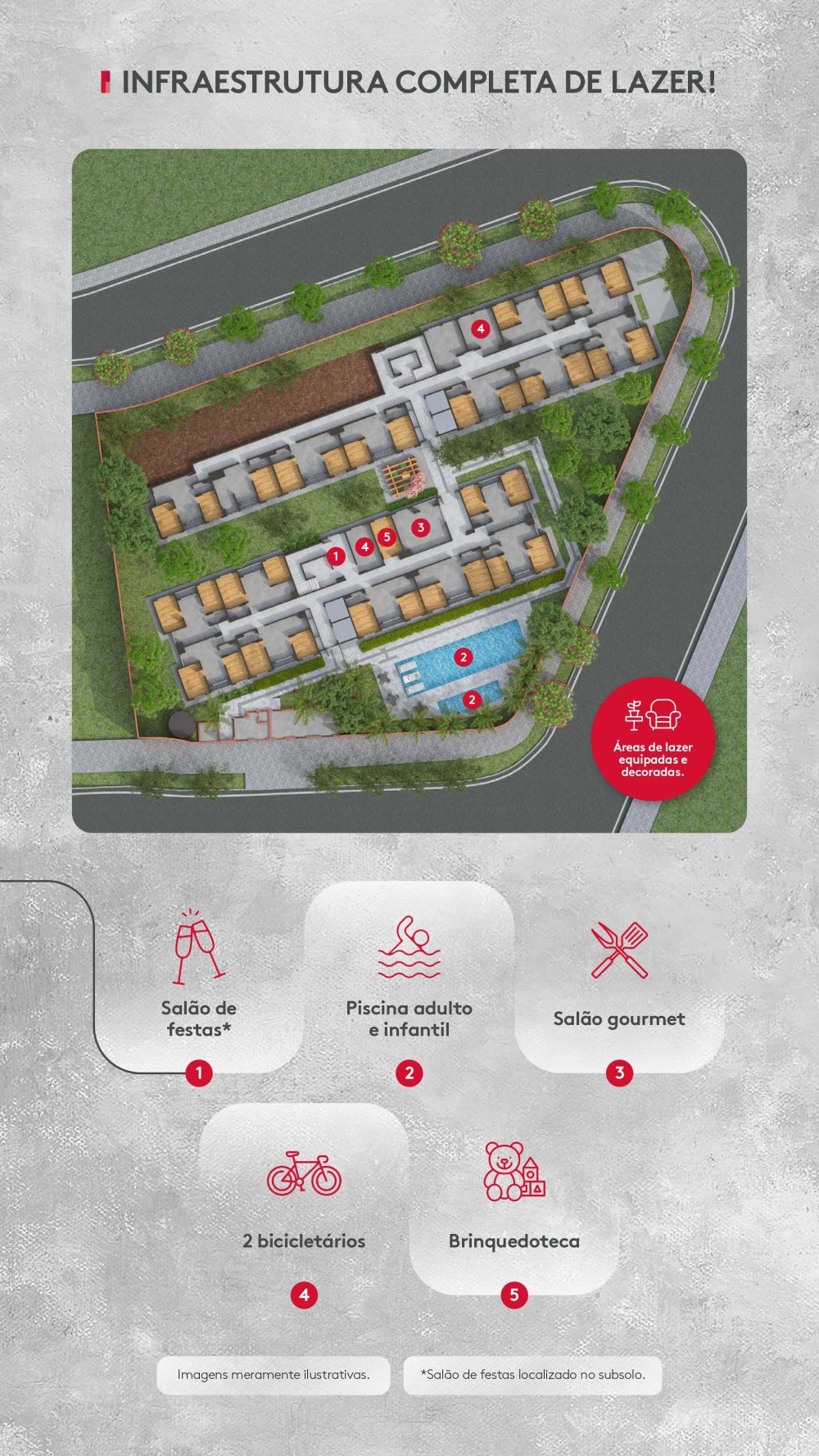 Lazer e Áreas Comuns: •Salão de Festas •Espaço Gourmet •Brinquedoteca •2 Bicicletários Áreas Externas •Piscina Adulto •Piscina Infantil