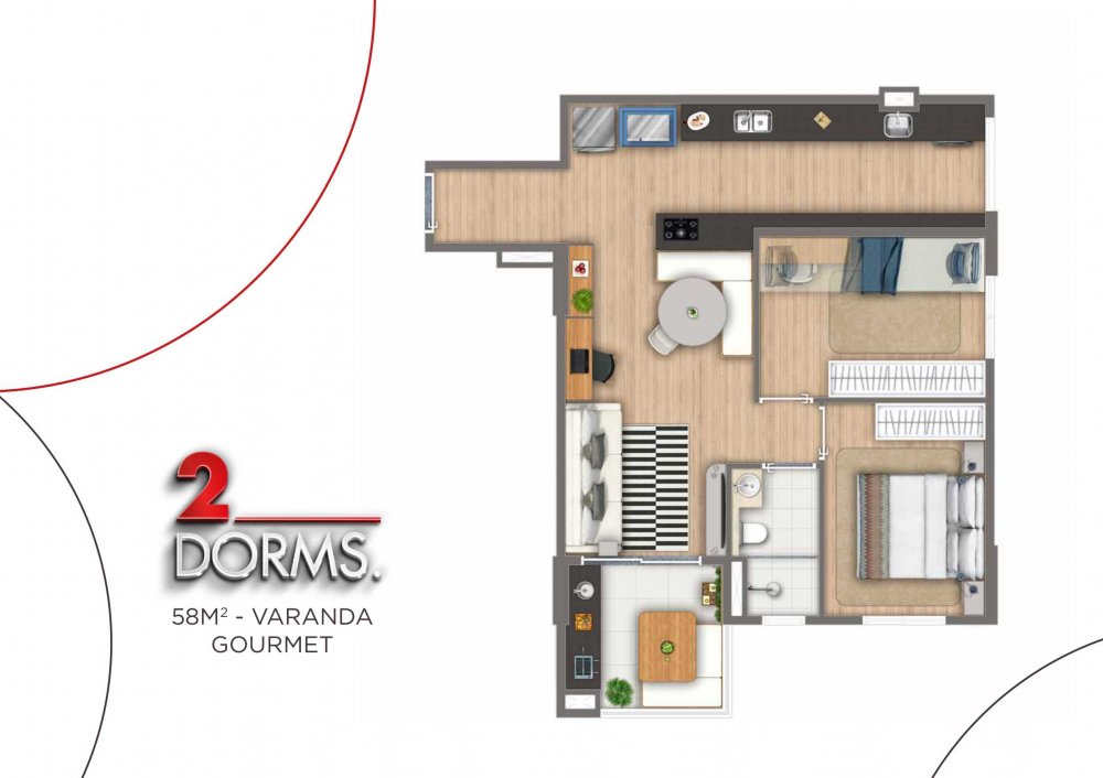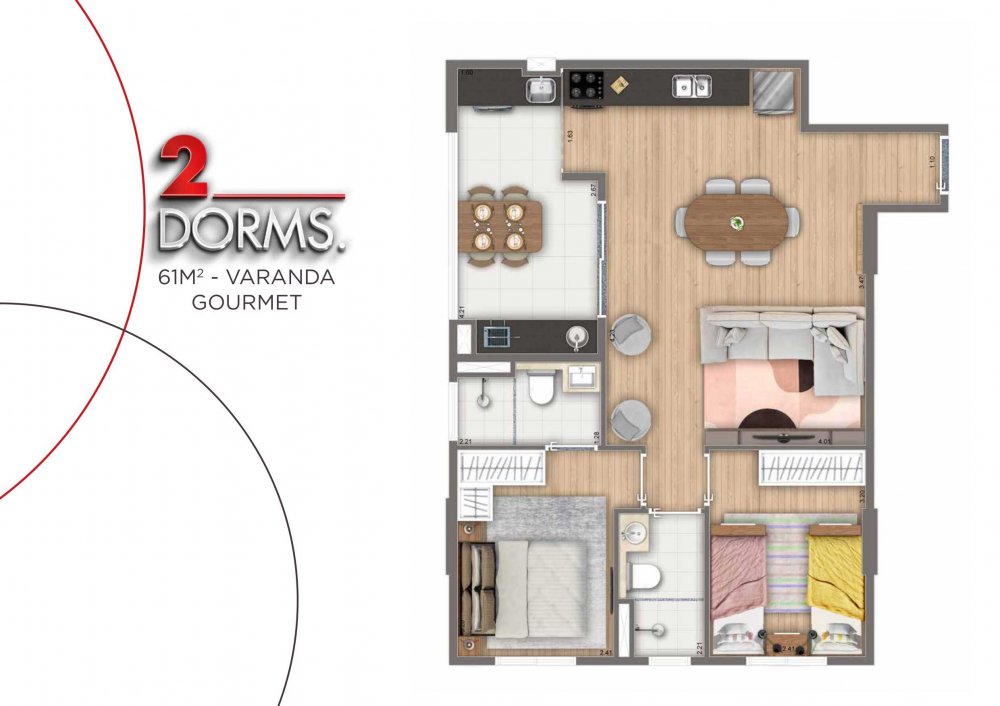 - Apto 2 Dorms = 61,31 m² com Suíte e 2 Vagas de Garagem