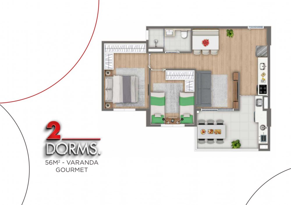 - Apto 2 Dorms = 56,23 e 58,07 m²