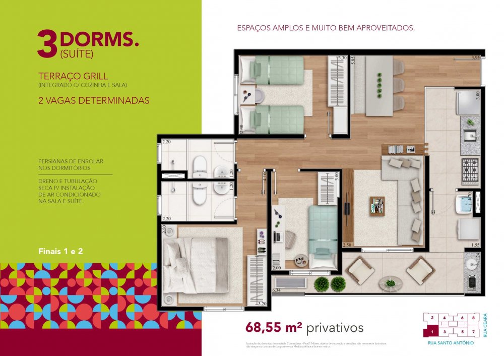 3 Dormitórios (1 Suíte) - Terraço grill - 68,55m² privativos - 2 vagas