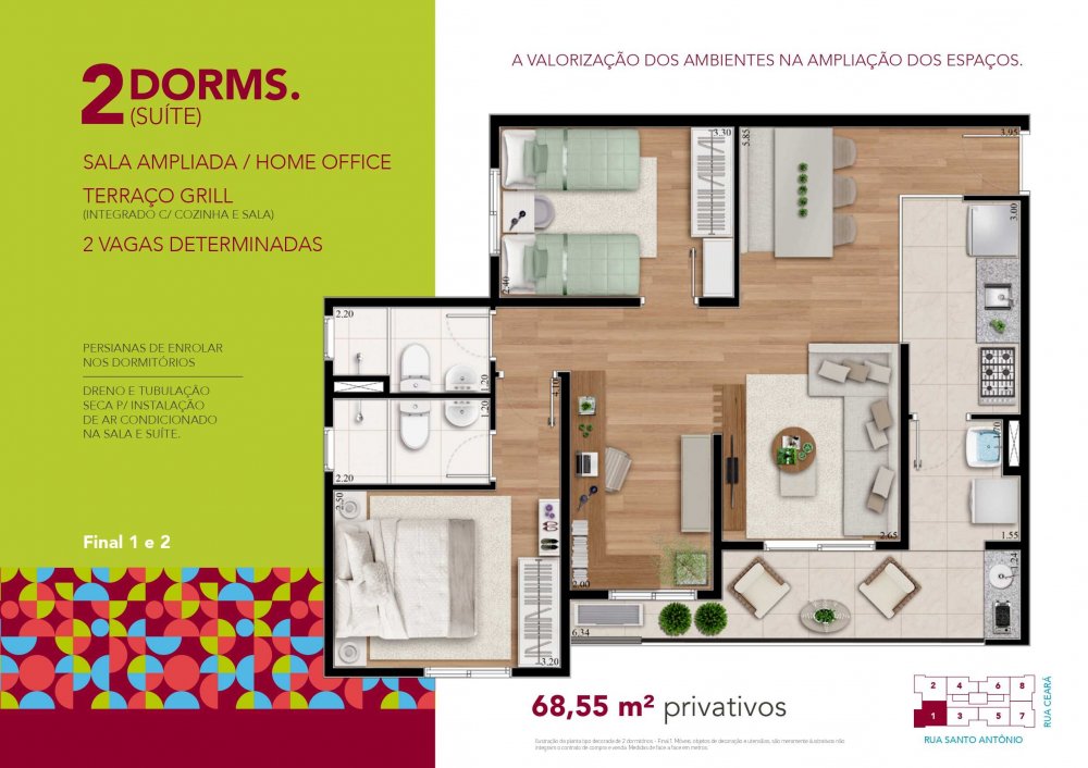 3 Dormitórios (1 Suíte) - Terraço grill - 68,55m² privativos - 2 vagas