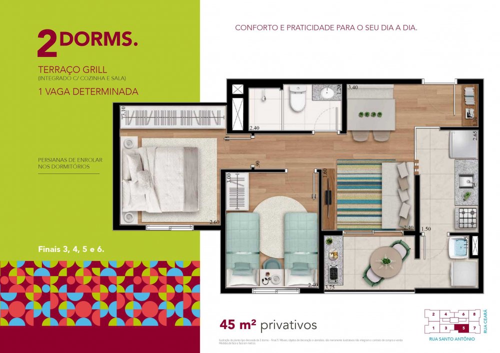 2 Dormitórios - Terraço grill - 45m² privativos - 1 vaga